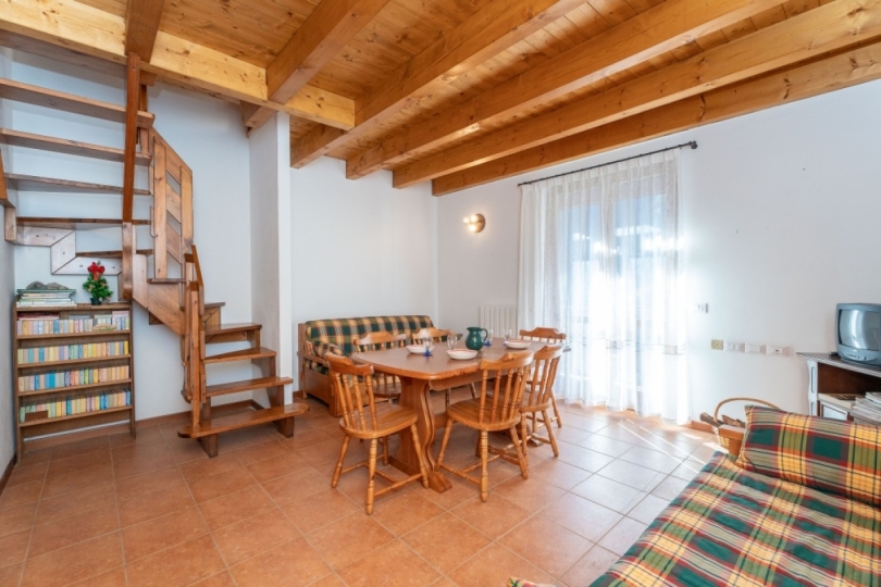 Immerso in un tranquillo complesso residenziale costruito nel 2005, questo appartamento racconta subito la sua atmosfera montana grazie alle splendide travi a vista che dominano gli spazi. Varcando la soglia, si viene accolti da un’ampia zona living luminosa, dove il soggiorno diventa il cuore pulsante della casa, perfetto per serate di relax. L’angolo cottura si integra armoniosamente, rendendo gli ambienti pratici e accoglienti.