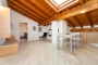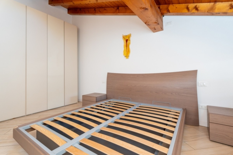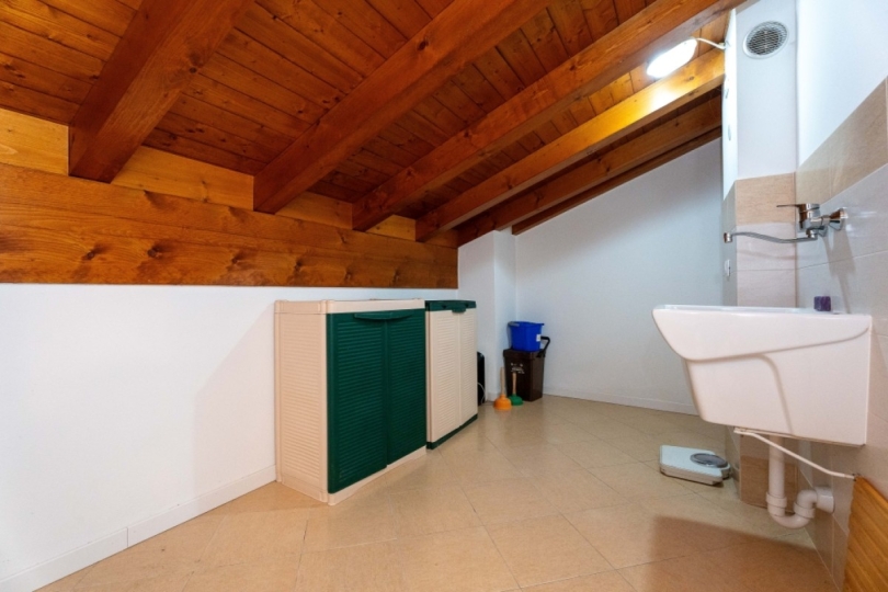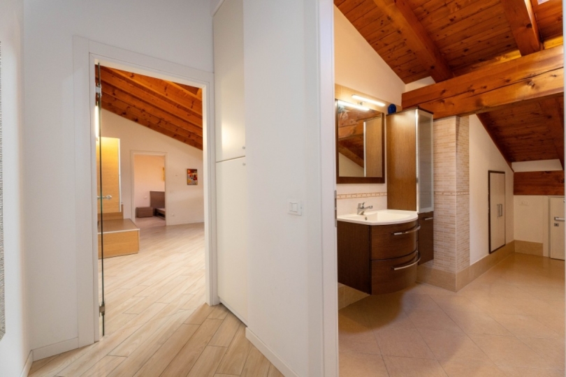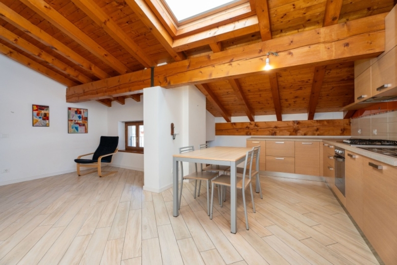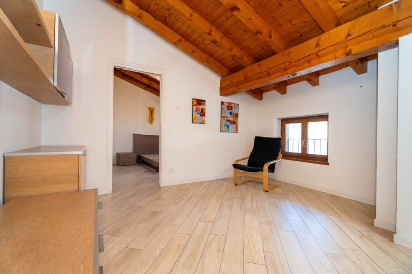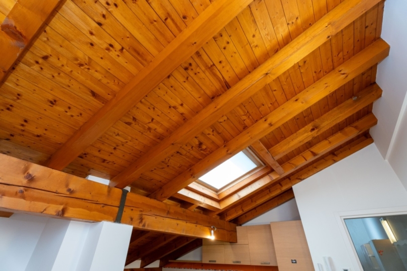 Appena entrati, lo sguardo viene rapito dall’alto: una magnifica trama di travi a vista percorre ogni stanza, creando un’atmosfera intima e protetta. È una casa che ti abbraccia, dove la luce gioca tra le pendenze del tetto e il calore si diffonde in modo invisibile grazie al riscaldamento a pavimento, regalandoti il piacere di camminare a piedi nudi anche nelle sere d'inverno.