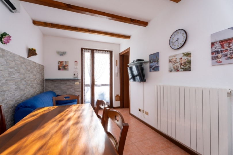 Entrando, il calore del camino ti accoglie subito, creando quell’atmosfera intima che solo una casa di montagna sa dare. Il soggiorno si apre sul tuo giardino privato, uno spazio verde tutto per te, perfetto per colazioni al sole, relax dopo una giornata all’aperto o per goderti il silenzio della natura.