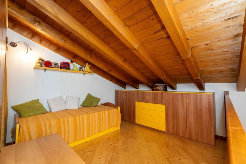 Le travi a vista e il piano superiore interamente rivestito in legno donano all’ambiente un’atmosfera unica, intima e ricca di charme.