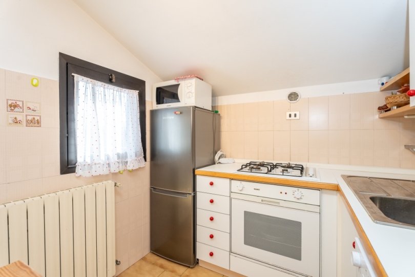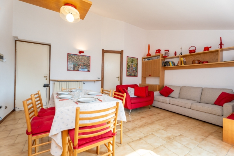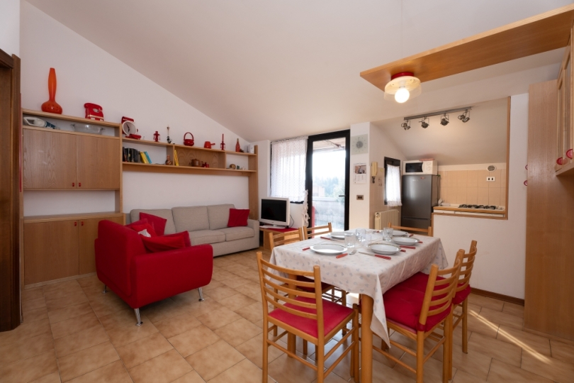 Immagina di varcare la soglia e lasciarti il mondo alle spalle. Il soggiorno e il cucinotto ti accolgono in un'atmosfera calda, ma è verso l'esterno che lo sguardo corre subito: