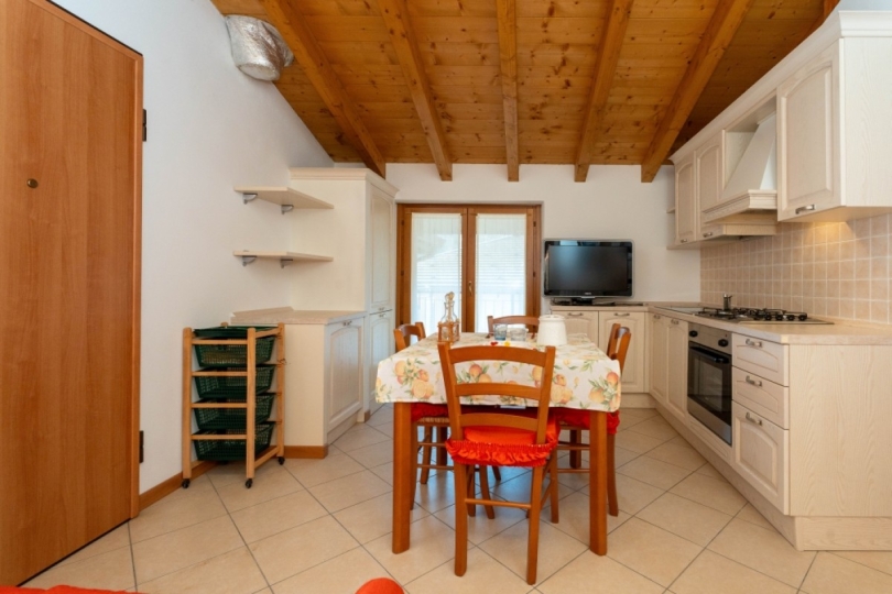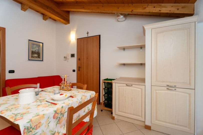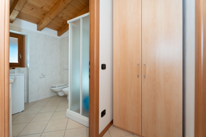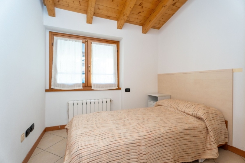 Siamo al secondo piano di una costruzione del 2006, dove il calore del legno e le travi a vista avvolgono ogni ambiente.