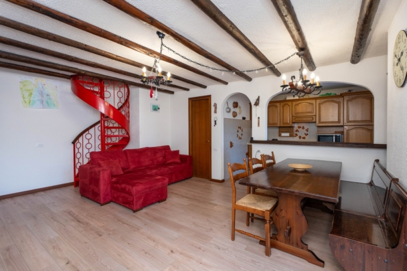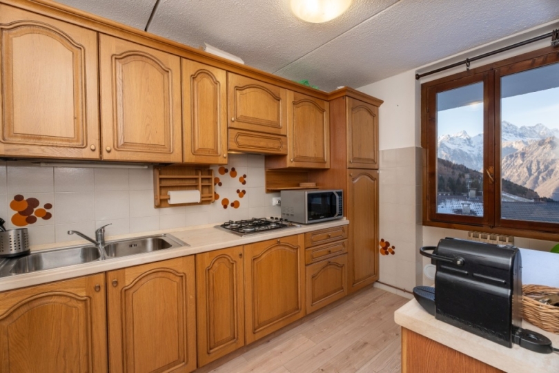 L’ingresso si apre su un accogliente soggiorno, dominato da uno splendido camino: il fuoco acceso accompagna le serate d’inverno, mentre fuori la vallata si accende di luci e silenzi. La cucina è il luogo perfetto per condividere momenti semplici e autentici. Dal balcone, lo sguardo si perde tra le montagne, regalando ogni giorno un’emozione diversa.
